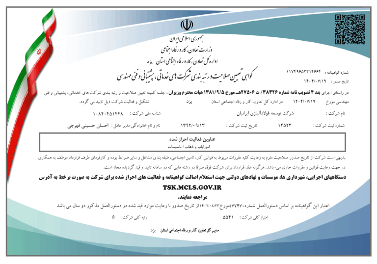شرکت توسعه فولاد آلیاژی ایرانیان موفق به دریافت گواهی تعیین صلاحیت و رتبهبندی شرکتهای خدماتی، پشتیبانی و فنی مهندسی از اداره تعاون،کار و رفاه اجتماعی استان یزد گردید. امیداست این دستاورد بزرگ، موجب ارتقاء جایگاه شرکت توسعه فولاد آلیاژی ایرانیان در صنعت فولاد و سایر صنایع و توسعه هرچه بیشتر فعالیتهای پشتیبانی و خدمات مهندسی